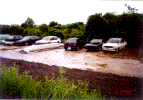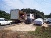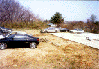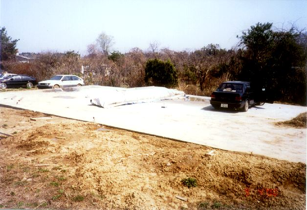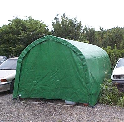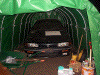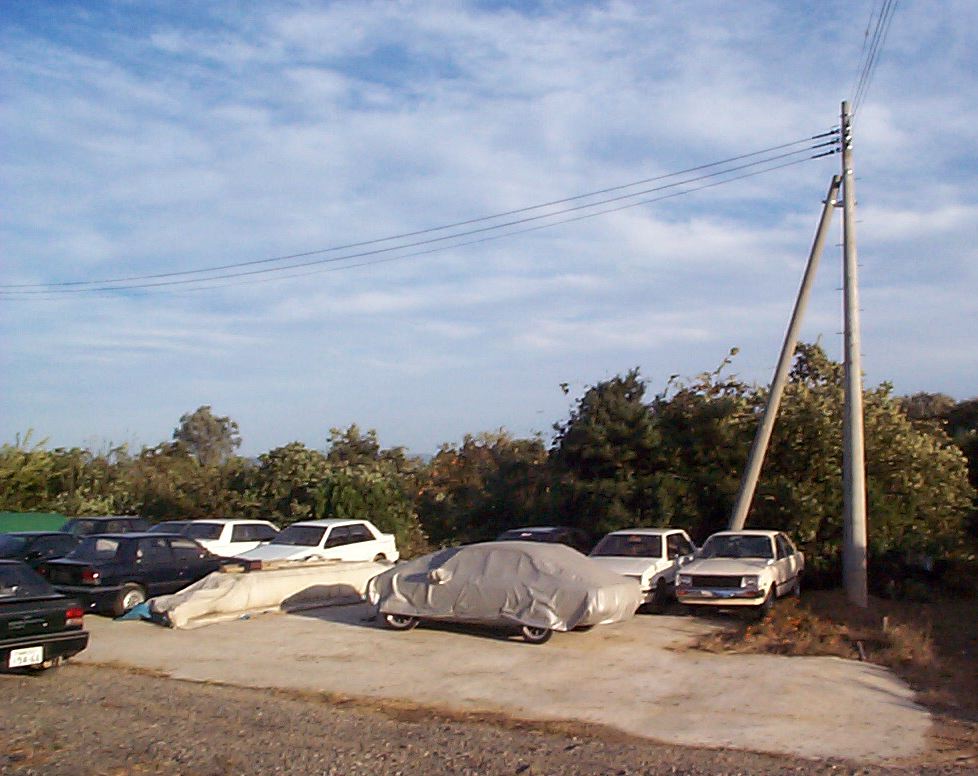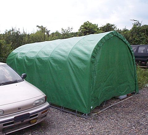 とりあえず雨と日ざしを避けるために安く済む物はないかと思案した結果、パイプ車庫を建ててみることに決定。近所の「トステムビバ」でカタログを見て取り寄せてもらいました。B778Mというタイプで、間口2700mm×奥行4800mm×高さ2000mmの物です。価格は24800円也。建てたときにはデジカメを持っていなかったので作り方の写真は無いのですが、完成使用写真をのせておきます。アンカーを沢山打つので風にはとりあえず大丈夫みたいです。心配ならベースフレームに板を載せてそれを車で踏むようにすれば大丈夫かと思います。