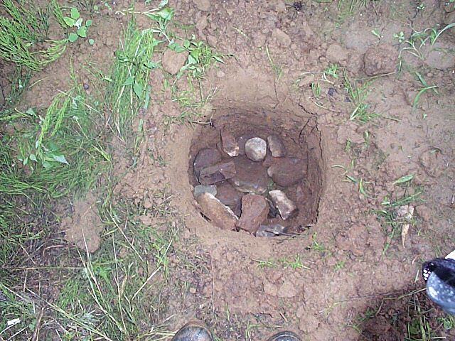 50cmぐらい掘ってようやく固い土が現れたので大きめの石を入れます。